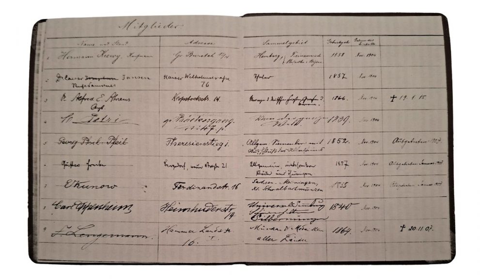 Als sich am 15. November 1904, 14 Münzenfreunde trafen, wurde die Gründung des Vereins beschlossen, die Satzung abgefasst und der erste Vorstand gewählt. Unter den Vorstandsmitgliedern war auch Justus Brinckmann, der Direktor des Museums für Kunst und Gewerbe in Hamburg. Dessen Mitgliedschaft zeigt eine enge Bindung des Vereins an die Wissenschaft. Die übrigen Mitglieder waren Münzenfreunde mit mehr oder weniger umfangreichen Sammlungen, die sich an den zu den Sitzungen mitgebrachten Münzen erfreuten und sich darüber austauschten. Die Sitzungen haben in der ersten Zeit in der Gaststätte Hackerbräu am Alten Wall, stattgefunden, ab 1907 im Gebäude der Patriotischen Gesellschaft.